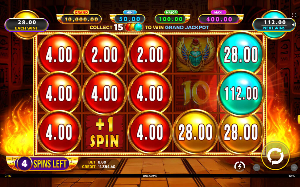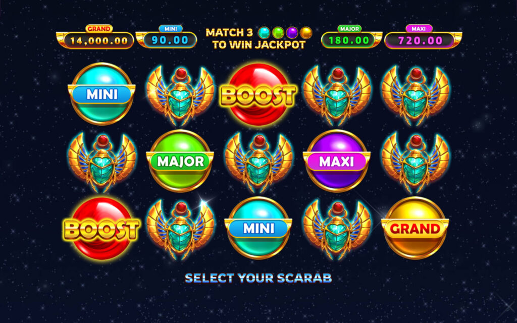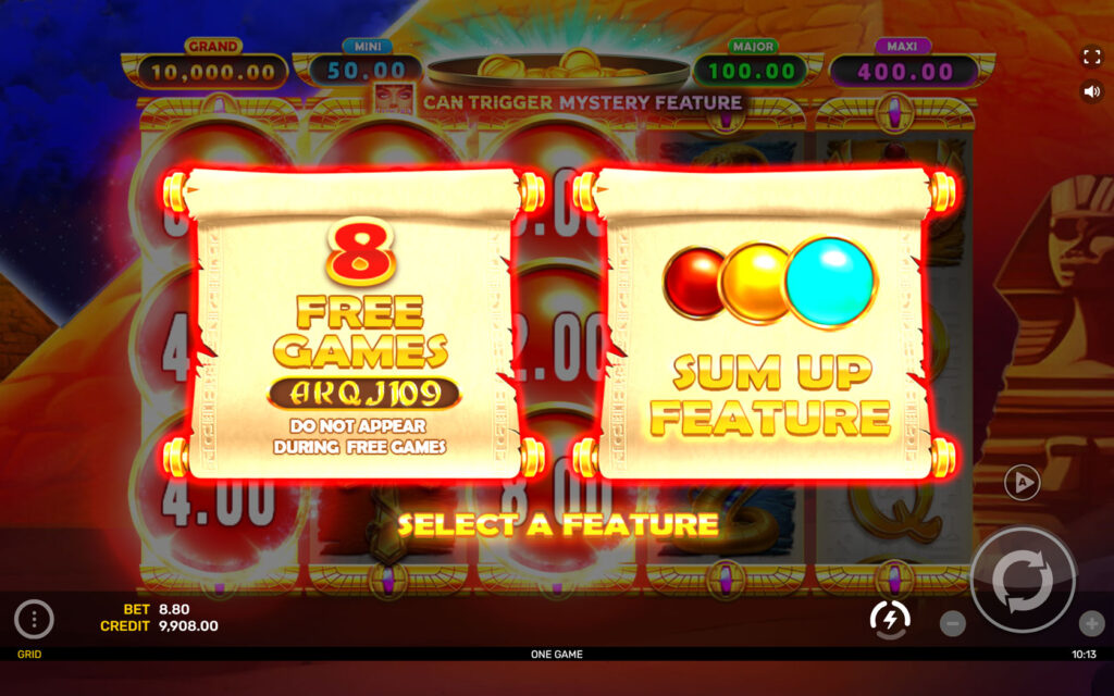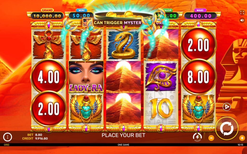 LADY OF RA is a tale of an Egyptian Queen whose immense wealth was amassed through her devout adoration of the sun god, Ra! In this mysterious 5×3 slot game with 243 win-ways and 4 jackpots, you have the chance to claim wealth through three distinctive bonus features: Two are unveiled after 6 or more RED SUN OF RA symbols offer you a choice of either 8 FREE GAMES that can be retriggered and where each new RED SUN symbol grants additional initial winnings, or a choice of the SUM UP FEATURE where GOLD and TURQUOISE SUN symbols join the RED SUN to sum up the riches bestowed by the SUN of Ra symbols. Should you succeed in filling all 15 reel positions with SUN of Ra symbols, the god Ra will bestow upon you the GRAND JACKPOT! Lastly, the gift of the MYSTERY BOOSTED JACKPOTS FEATURE may be randomly granted when the WILD symbol of the  LADY OF RA sends scarabs to the golden pot above the reels. This feature presents you with 15 scarabs, from which you must match 3 to one of the jackpots. Mixed among them are also 3 BOOST choices which increase the jackpots’ values.